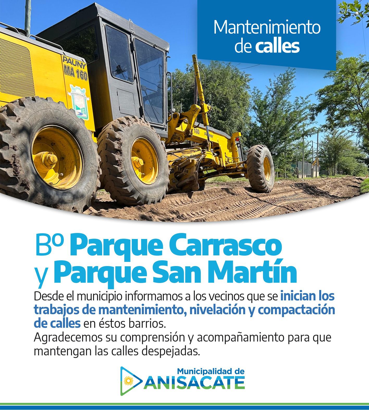 Desde el gobierno municipal de Anisacate comienzan este 2025 con la puesta en marcha del Plan Integral de arreglo de calles. El mismo se llevará a cabo en toda la localidad, barrio por barrio, calle por calle, de forma paulatina. Durante estos días, las tareas de mantenimiento, nivelación y compactación de calles se realizarán en los barrios Parque Carrasco y Parque San Martín.